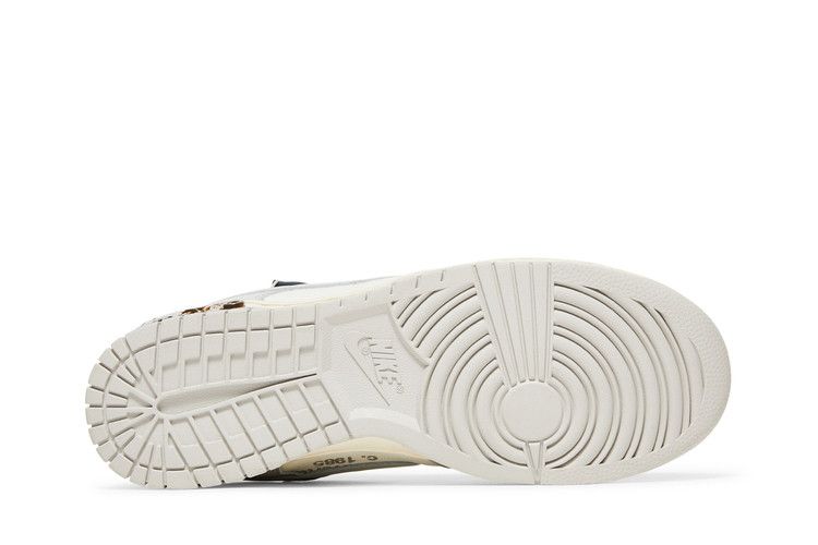 The Nike x Off-White Dunk Low Lot 41 features an upper of smooth white leather overlaid with soft gray canvas in an iconic Dunk design. Added to this design are several Off-White signature touches, such as a black alternate asymmetrical lacing system, Helvetica script, a hole punched through the tongue, a yellow zip-tie, and a blank yellow tab attached to the lateral Swoosh. This sneaker rests on a sail-colored foam midsole atop a pale gray rubber outsole.